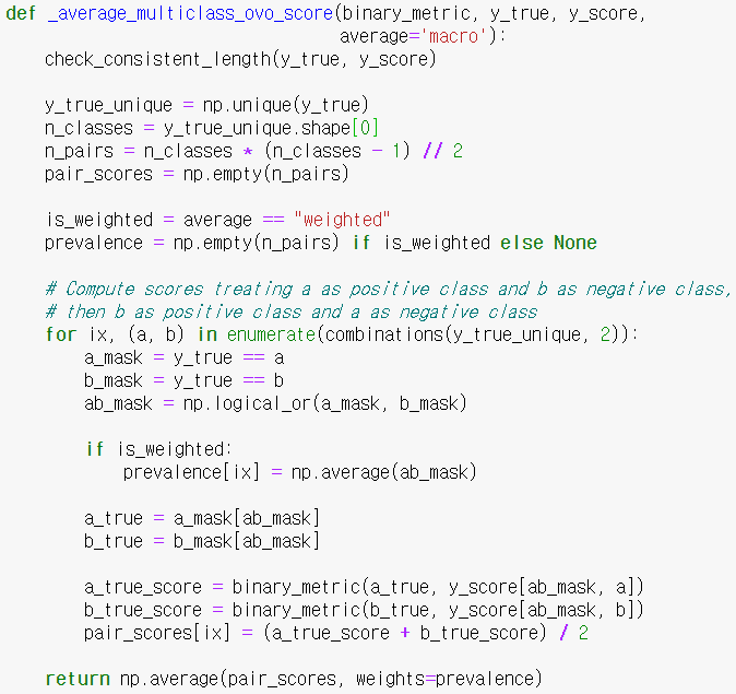 위 코드에서 _binary_roc_auc_score는 우리가 아는 이진 분류에서의 AUC를 계산해주는 함수로 보입니다. 이 함수는 _average_multiclass_ovo_score의 binary_metric 인자에 들어가게 됩니다. 실질적인 계산이 이루어지는 것으로 보이는 반복문을 살펴보겠습니다. 반복문에 나오는 combinations는 itertools 패키지의 함수로 위에서 두 개로 이루어진 조합을 반환합니다. 즉 $\sum^{c}_{j=1}\sum^{c}_{k>j}$ 처럼 생각할 수 있습니다. a_mask와 b_mask는 각각 실제 label이 a인 data들과 b인 data들을 알기 위해 0과 1로 나타낸 것으로 보이고요 ab_mask는 label이 a 또는 b인 data를 나타내는 것 같습니다. a_true와 b_true는 이를 통해 실제 label이 a 또는 b인 data만을 추출하였고 이 값은 binary_metric을 통해 계산되어 a_true_score와 b_true_score가 됩니다. binary_metric이 _binary_roc_auc_score이었으므로 AUC값이 계산되어 들어갔을 것입니다. 그런데 실제 나중에 평균을 구하게 되는 pair_scores에 a_true_score와 b_true_score가 더해진 후 2로 나누어져 들어가게 됩니다. 평균을 구하는 과정은 모두 더하고 총 개수인 $\frac{c(c-1)}{2}$로 나눈다고 생각해보면 scikit-learn의 설명과 달리 실제 논문과 같은 식으로 계산하는 것으로 보입니다.