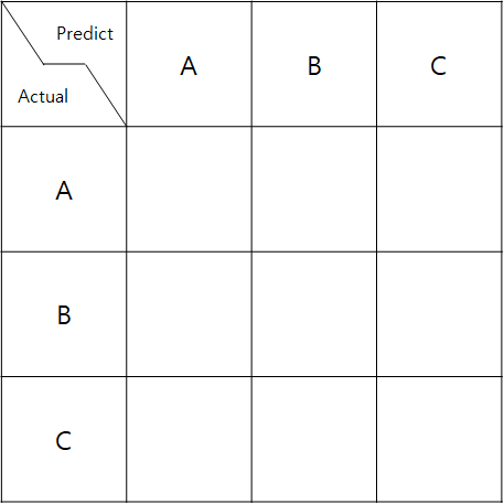 이전 글에서는 이진 분류의 평가 지표들에 대해 알아보았습니다. Titanic 생존자 예측과 같은 경우에는 target이 0과 1, 즉 이진 분류로 해결할 수 있는 문제인데요, 분류 문제를 보면 항상 2가지로 나누는 문제만 있는 것은 아닙니다. 예를 들면 Iris 품종 예측과 같은 경우가 있죠. Setosa, Versicolor, Virginica 3가지로 분류하게 되는데 이 경우에도 이전 글에서 정의한 여러 평가 지표들을 사용할 수 있어야 합니다. 많은 지표들이 Confusion matrix를 통해 정의되므로 우선 Confusion matrix를 그려보도록 하겠습니다. 편의상 class의 이름은 A, B, C 세 개로 하겠습니다.
