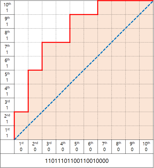 우선 ROC curve를 한 번 다른 방식으로 해석해봅시다. ROC curve를 그리기 위해 threshold가 움직이는 그 값에 대해 각 data를 정렬해볼 수 있습니다. 위 그림에서는 맨 아래 적힌 수열이 되겠습니다. 오른쪽으로 갈 수록 0이 많아지는 것으로 보아 그 값은 아마 모델이 예측한 0일 확률이 될 것 같네요. threshold가 움직이면 각각의 숫자 사이를 지나게 될 것입니다. 그러다가 하나의 숫자를 통과하게 된다면 Confusion matrix의 값이 바뀌며 ROC curve 상에서는 점이 움직이며 자취를 남기게 되겠죠. 만약 1을 통과하게 되었다면 Sensitivity를 바꾸게 될 것이고 0을 통과하게 된다면 False Alarm rate를 바꾸게 됩니다. 아래의 예시에서 1과 0의 개수는 각각 10개이므로 $\frac{1}{10}$만큼 그 값이 바뀔 것입니다(Sensitivity와 False Alarm rate의 분모는 각각 1과 0의 총 개수인 것을 생각해봅시다).
