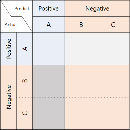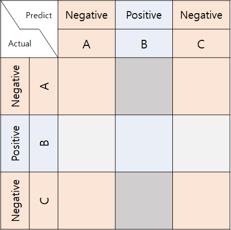아마 Confusion matrix는 위 그림처럼 생겼을 것입니다. 빈 칸에는 각 조건에 맞는 data의 수가 적힐 것이고요. 이제 이진 분류와 같이 각 평가 지표들을 계산해보려 한다면 한 가지 문제가 있게 됩니다. 바로 TP, FN, FP, TN을 정의할 수 없다는 것입니다. 뭐.. Accuracy 계산은 대충 느낌이 오지만 다른 값들도 계산하려면 필요하겠죠. Multiclass Classification에서는 각각의 class별로 TP, FN, FP, TN값을 따로 정의하게 되고 그 값들을 이용하여 계산하는 방법에 따라 micro average와 macro average 지표 두 가지가 나타나게 됩니다.