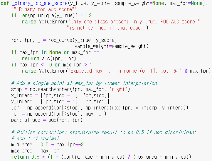 sklearn 다운받은 위치를 가서 metric이라는 폴더에 _ranking.py와 _base.py에 roc_auc_score함수와 이 함수가 호출하여 계산이 이루어지는 함수들의 코드를 볼 수 있었습니다. 코드가 너무 긴 관계로 주석을 제거한 코드를 보면 아래와 같습니다.