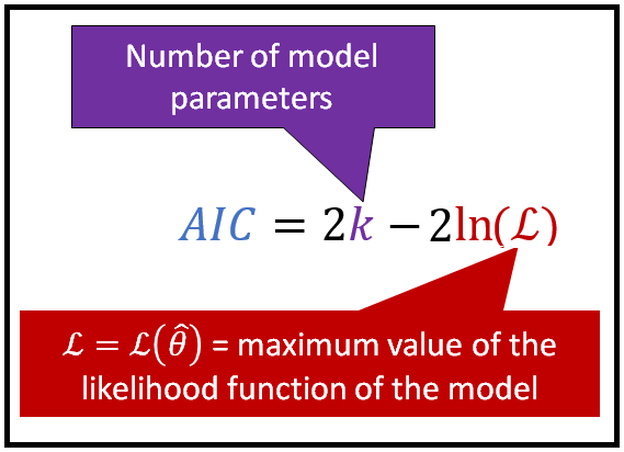 parameter가 적으면 적을수록, likelihood function의 maximum이 클수록 값이 작아진다. 즉 AIC가 작은 모델이 좋다고 생각하면 된다.