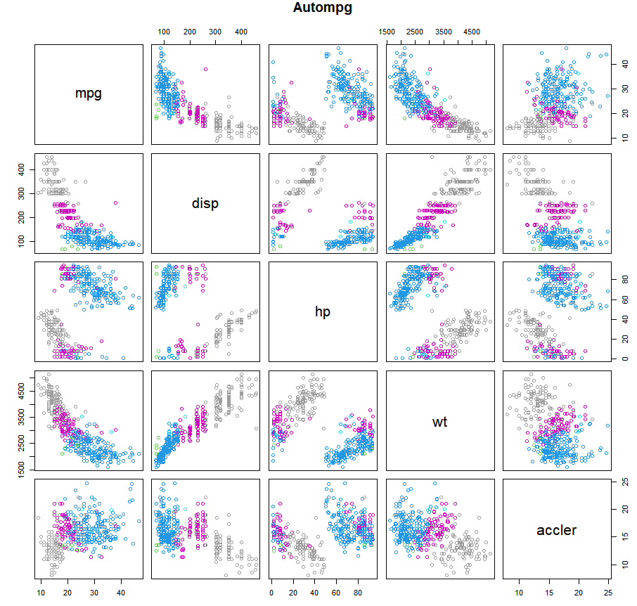 pairs(car[var1], main ="Autompg",cex=1, col=as.integer(car$cyl))