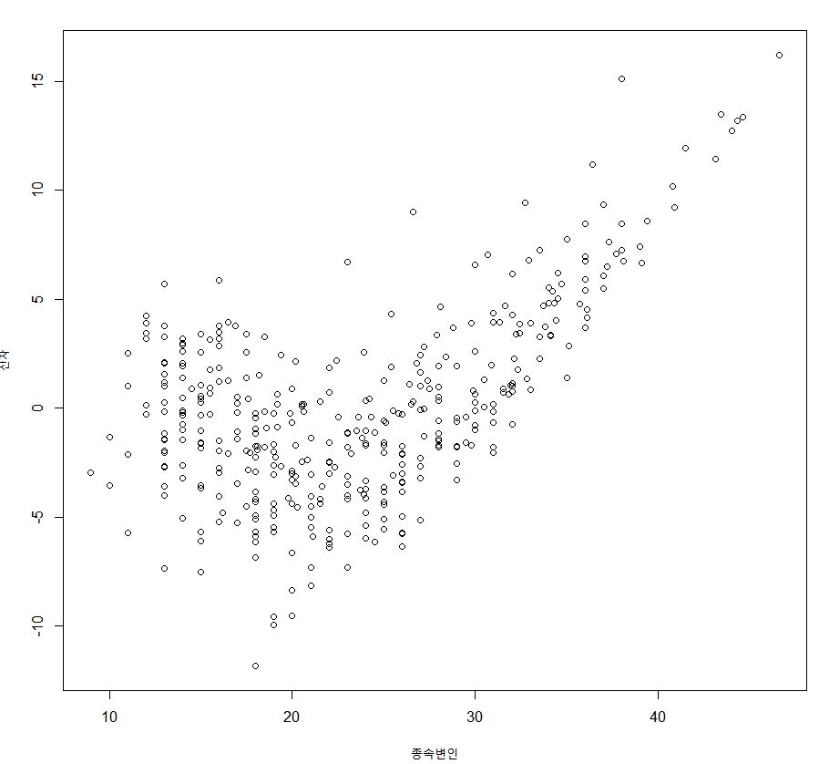 종속변인의 크기가 커질수록 잔차의 범위가 커지므로 등분산성을 나타내지 않는다.